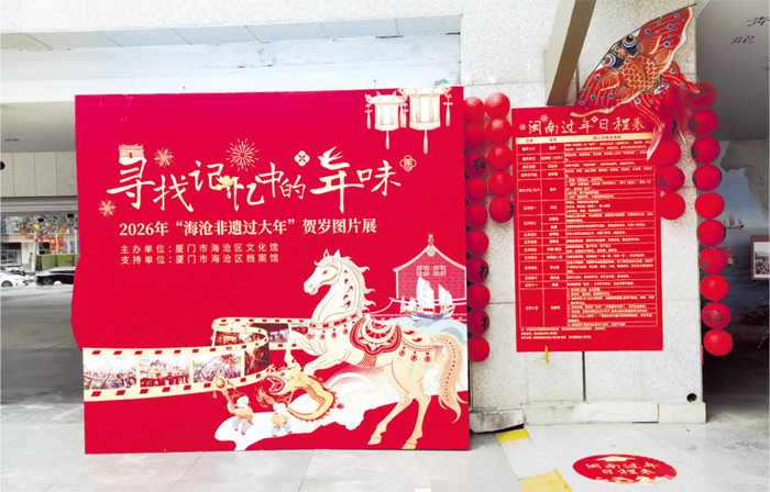 展览以馆藏档案为基础,围绕4个主题板块呈现闽南春节文化。依据不同时期的文献资料整理出“闽南过年日程表”,清晰展示从备年货、祭灶、贴春联到守岁、拜年的传统年俗流程。依托民俗档案绘制《海沧春节习俗全景》,生动呈现各村社的特色年俗。以非遗档案为线索,设置“非遗守住乡愁”板块,讲述非遗技艺的传承故事。借助馆藏人物资料集中展示《非遗传承全家福》,用照片定格非遗传承人的风采。