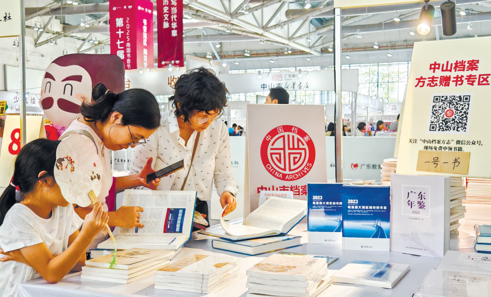 赠书包括《中山印记》《中山村情》《嘉靖〈香山县志〉校注》《岐江河一河两岸发展简史》《中山方言志》等中山档案方志成果以及《广东乡村经典菜肴》《和岭南古树交个朋友》等广东省地方志办精心打造的地情成果。其中,《中山印记》巧用珍档,为读者再现中山的氤氲旧事;《嘉靖〈香山县志〉校注》通过典籍讲述中山历史脉络;《岐江河一河两岸发展简史》以中山市“母亲河”岐江河一河两岸为线讲述因水而兴的中山发展历程;《中山村情》立足945个自然村落厚重的历史遗存,呈现中山城乡面貌变迁。专区吸引了众多观展群众,大家不时驻足翻阅,踊跃扫码领书。