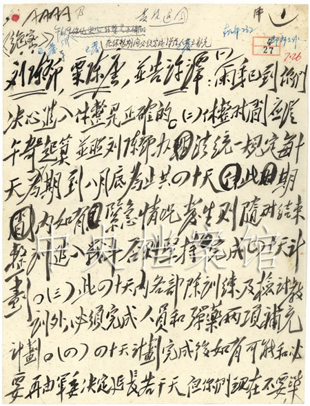 1948年7月26日:毛泽东起草的中共中央军委关于部队休整及下一步作战计划给刘伯承等的电报