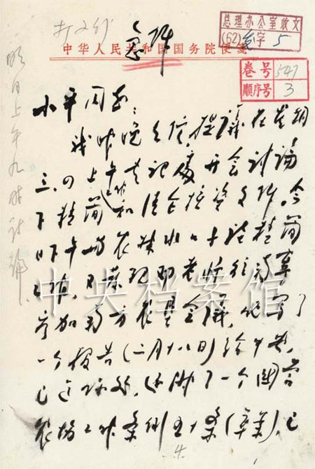 1962年2月20日:周恩来关于中央书记处会议要讨论的问题给邓小平的信(1)