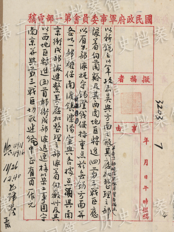 1. 1937年11月25日,蒋介石颁布第三、第七战区及首都卫戍战斗序列电(中国第二历史档案馆提供)