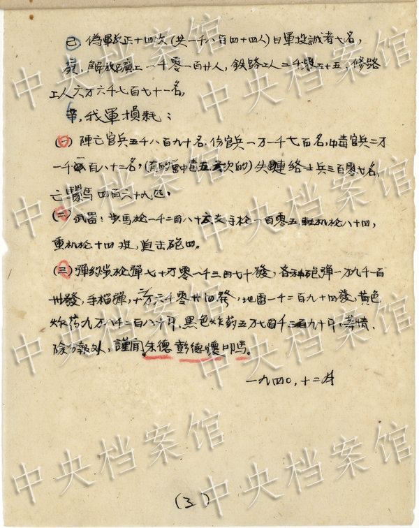 8. 1940年12月21日,朱德、彭德怀关于百团战绩致周恩来、叶剑英转蒋介石等电(中央档案馆提供)